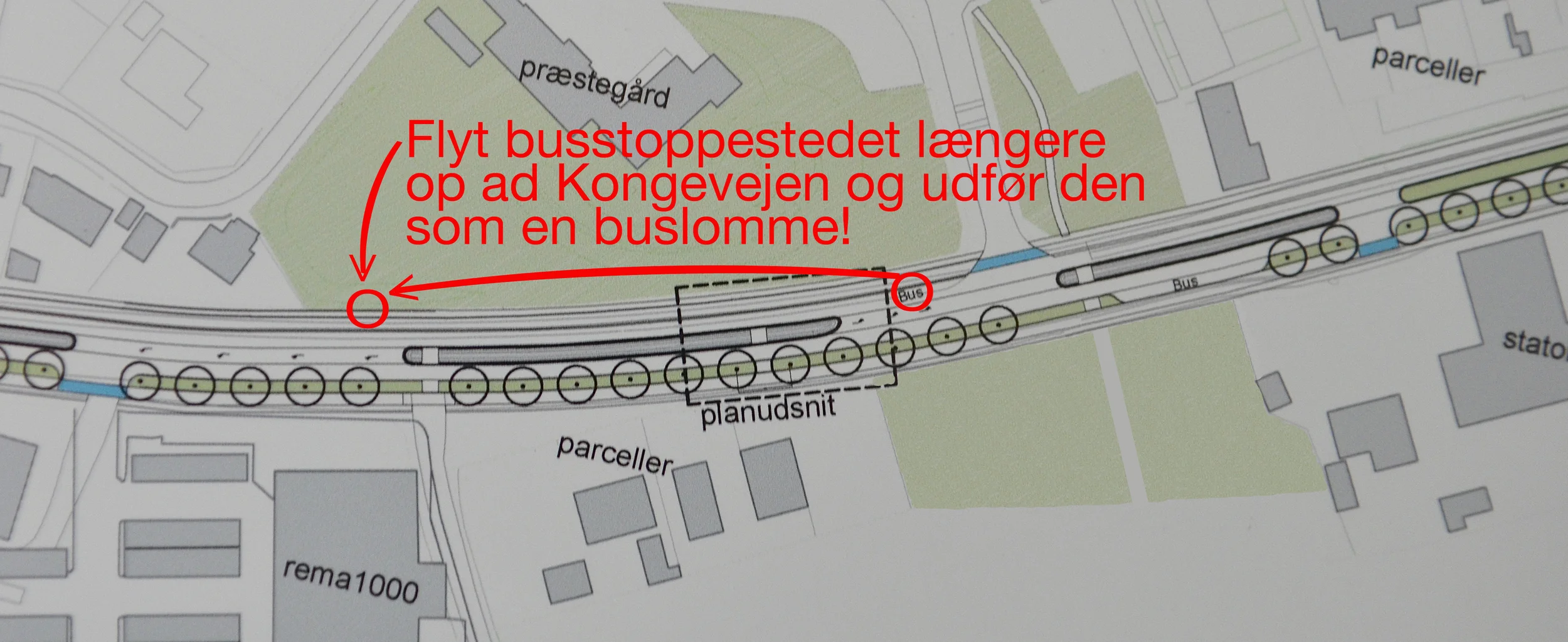 Som det fremgår af ovenstående udsnit af dispositionsforslaget, har Niras foreslået, at det ene busstoppested på Kongevejen placeres tæt op ad Blovstrød Byvej, hvilket flere Blovstrød-borgere mener er en uansvarlig løsning. Tekst: AOB