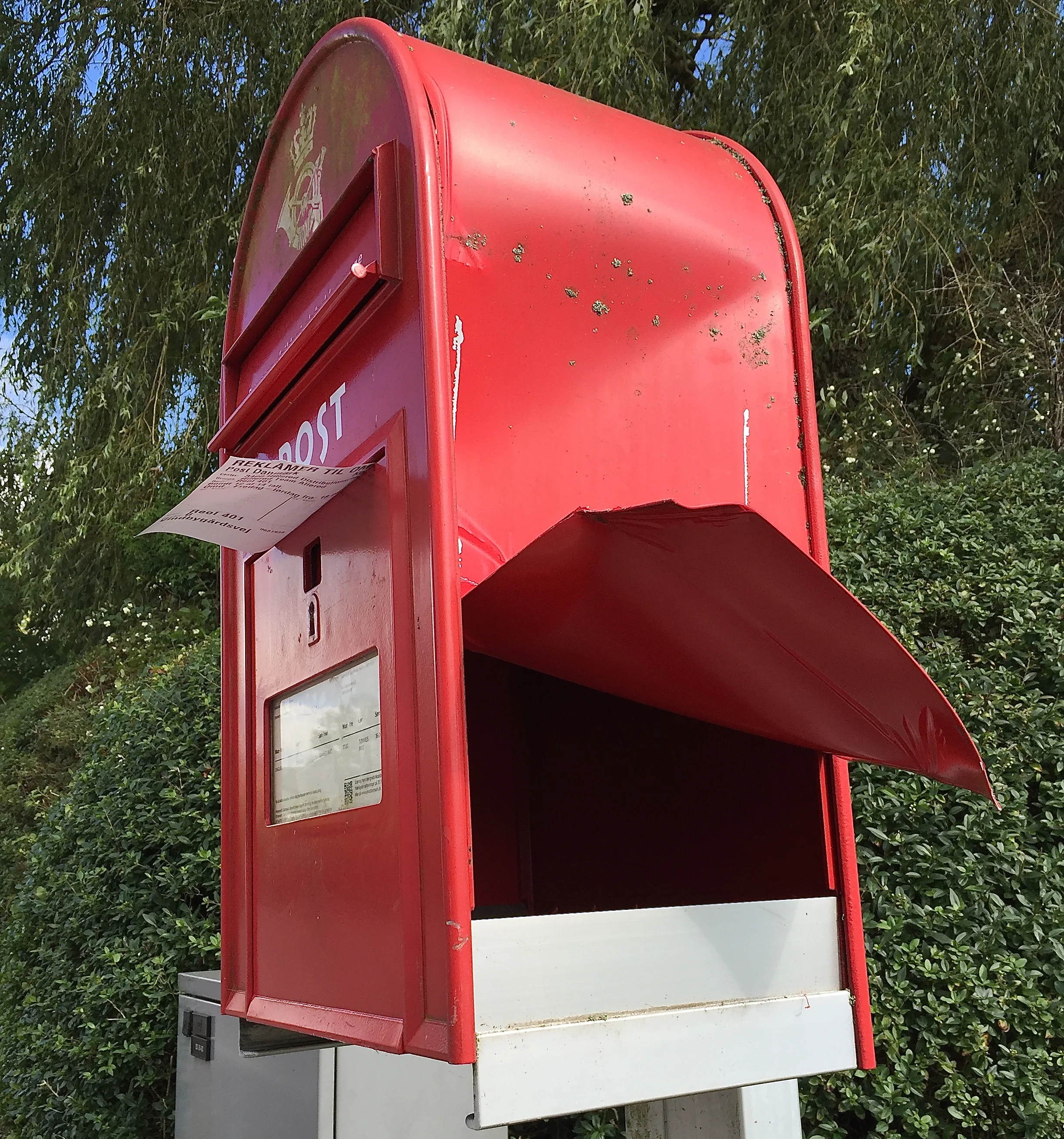 Den store, røde postkasse ved Blovstrød Byvej er ikke pæn mere. Den er blevet ødelagt af gerningsmænd, som sandsynligvis leder efter værdier i de postede breve. Foto: AOB
