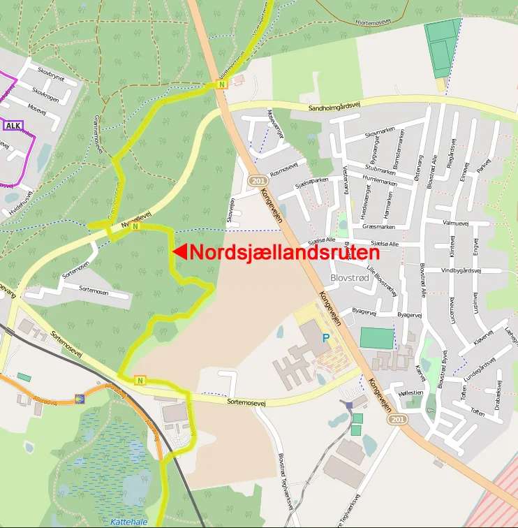 Som det fremgår af ovenstående kort, går 'Nordsjællandsruten' gennem udkanten af Blovstrød. Ruten løber bl.a. gennem Tokkekøb Hegn og videre gennem Sortemosen og øst om XL-BYG og videre under jernbanen til Allerød Sø.