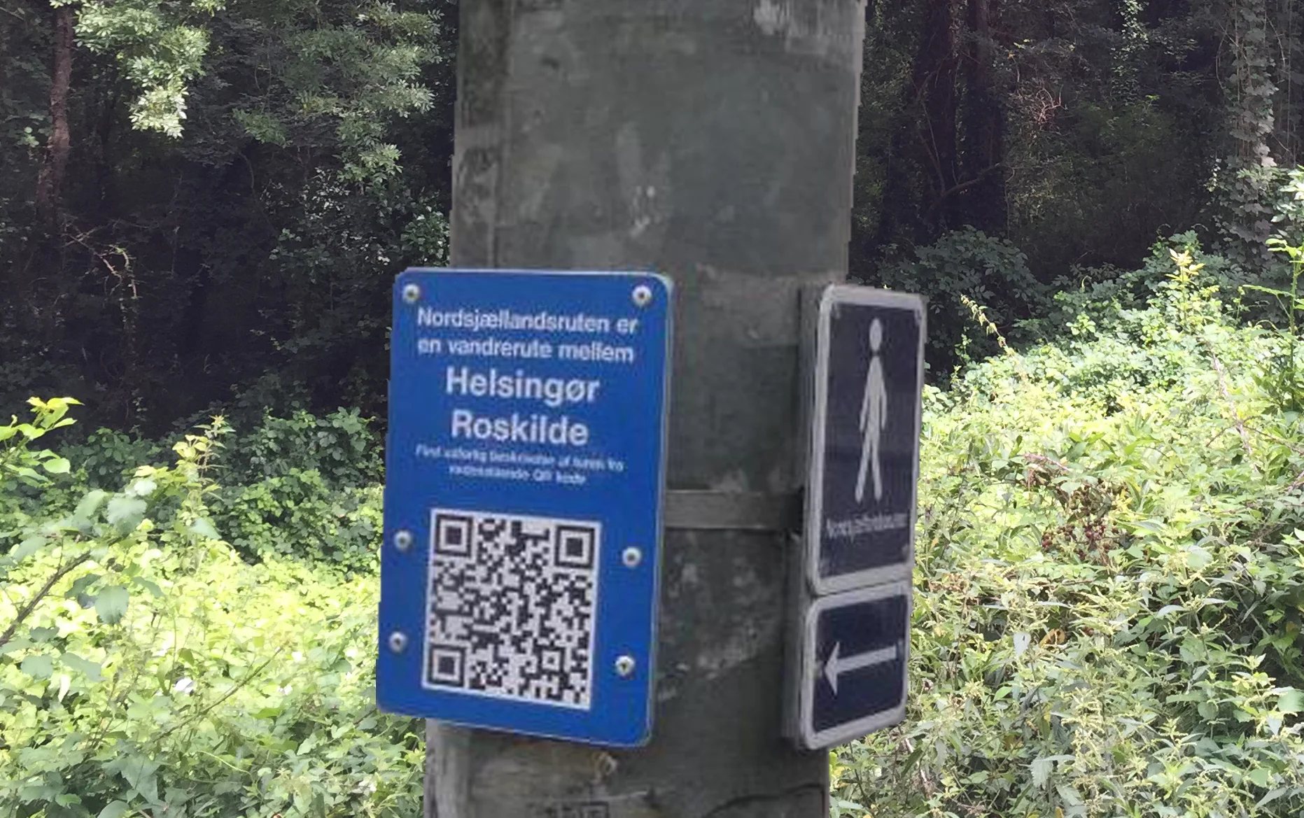 Ved udgangspunker fra stationer findes denne QR-kode, der leder ind på beskrivelsen af ruten.