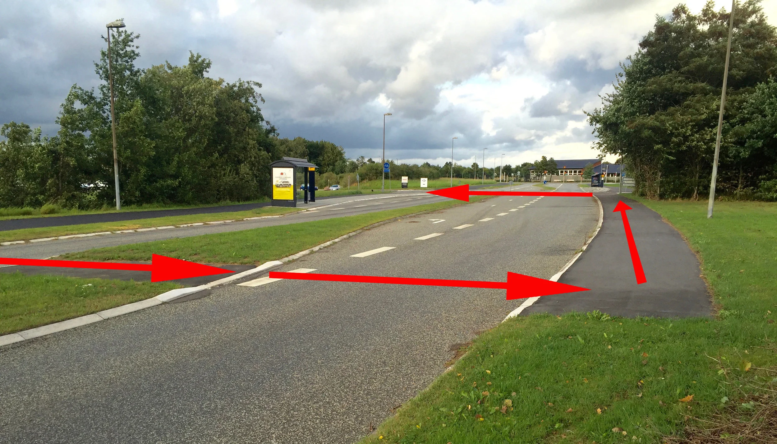 Så hvis man gerne vil cykle til Niras eller IBM fra stationen, så skal man først krydse Sortemosevej til venstre side ved ATP IT. Og så skal man ca. 35 meter før indkørslen til Niras og IBM, krydse tilbage til højre side og så krydse tilbage igen for at komme ind til Niras og IBM."