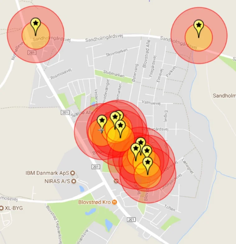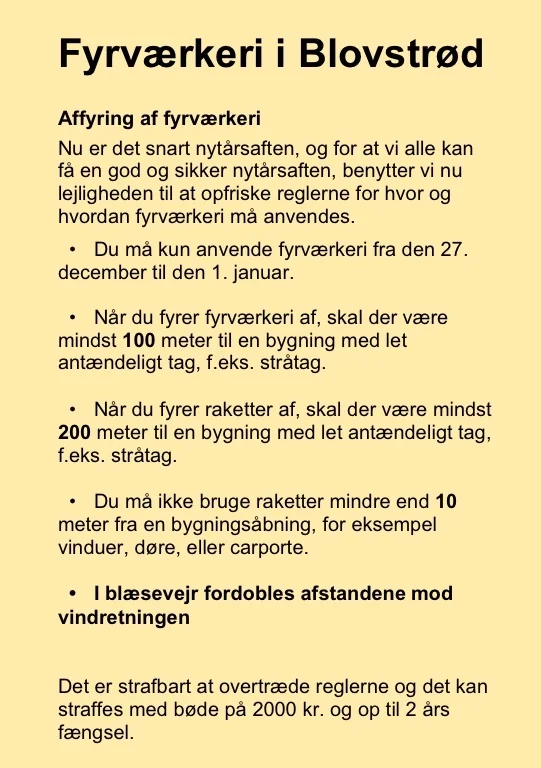 Kortet viser, hvor man ikke må fyre fyrværkeri af (100 meter - gul zone), og hvor man ikke må fyre raketter af (200 meter - rød zone). Der er således store områder i Blovstrød, hvor man overhovedet ikke må affyre raketter af - Og bemærk: I blæsevejr fordobles afstanden mod vindretningen!