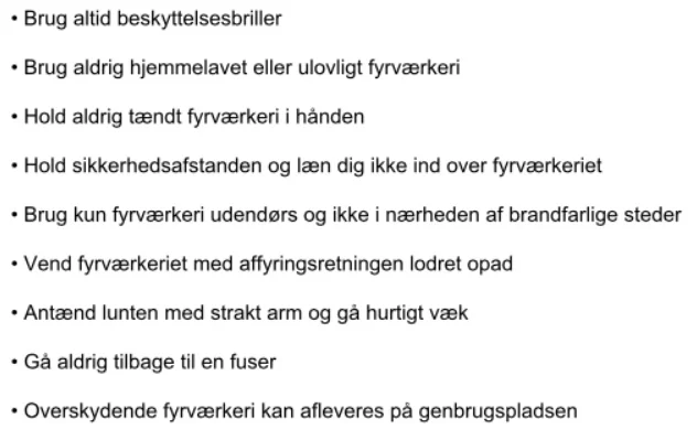 Læs mere om sikker brug af fyrværkeri på Sikkerhedsstyrelsens hjemmeside.