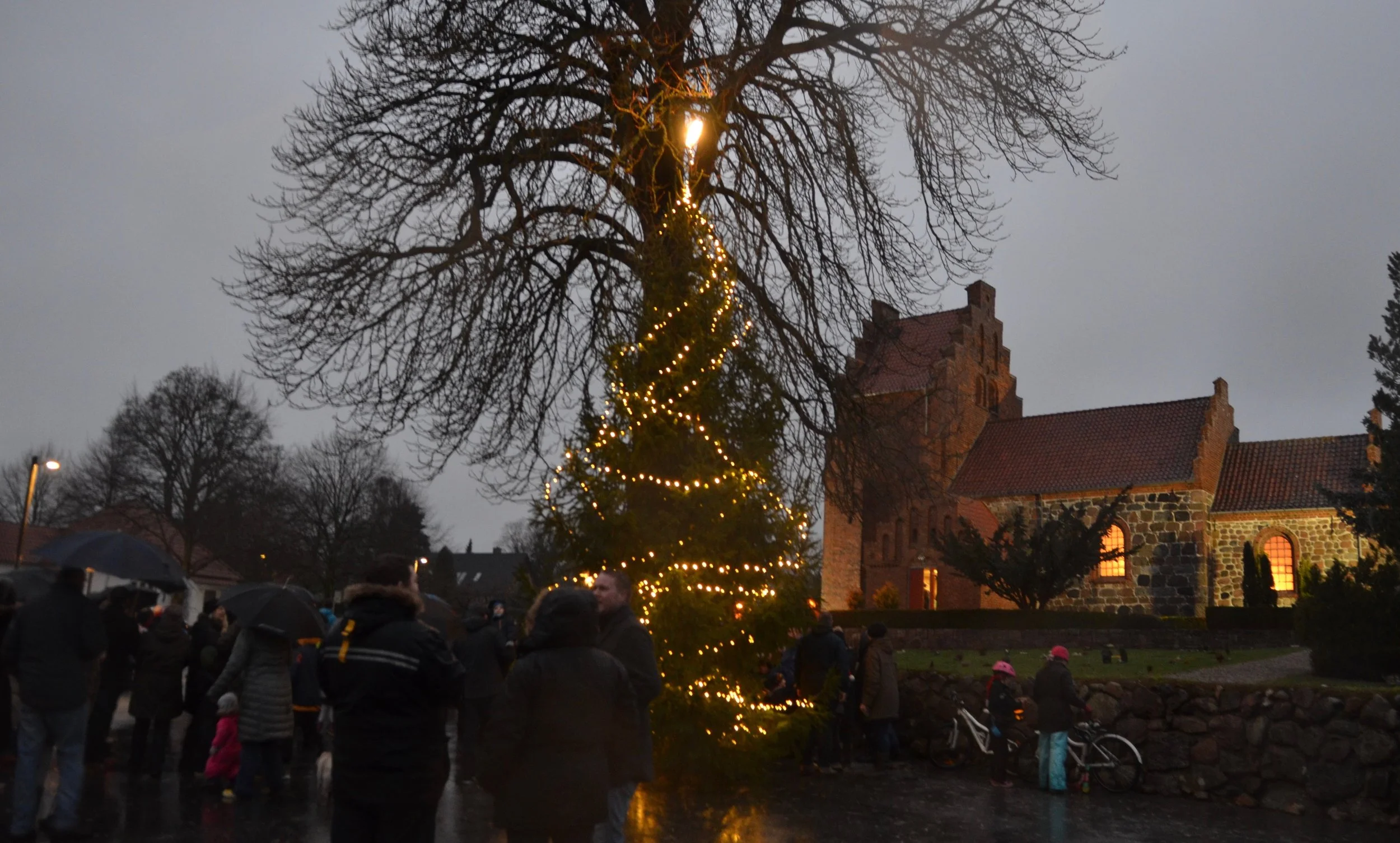 Det regnede pænt, da juletræet skulle tændes på kirkepladsen, men alligevel var der rigtig mange, som var mødt op for at fejre første søndag i advent. Foto: AOB