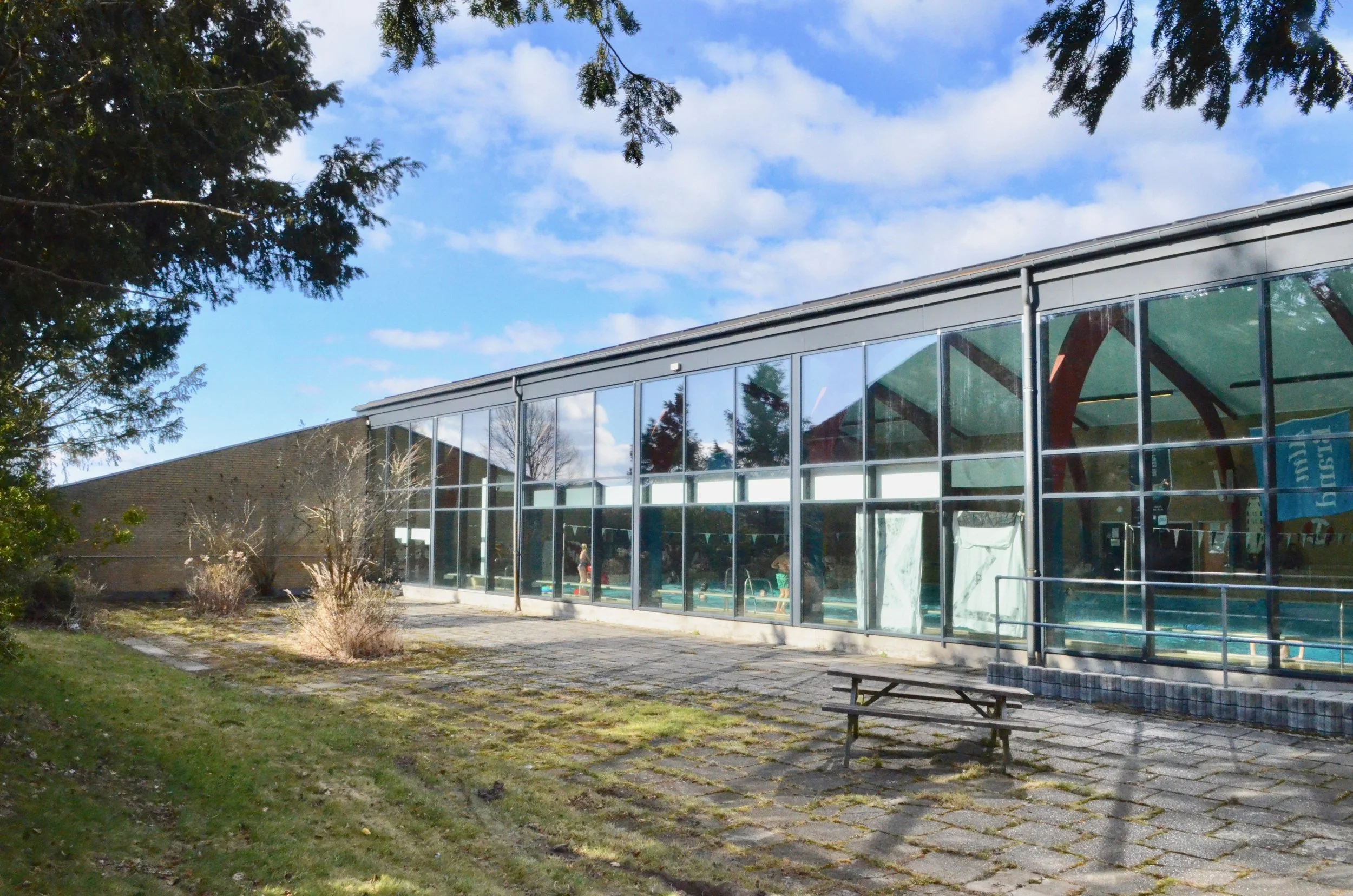 Dryland-tilbygningen etableres langs hele svømmehallens sydfacade mellem de to markante læmure. Det kan ikke undgås, at tilbygningen vil tage en stor del af dagslyset til selve svømmehallen - helt afhængig af, hvor høj tilbygningen bliver. Foto: AOB