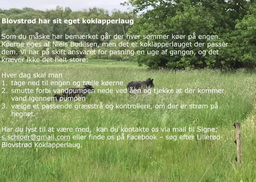 Bestyrelsen oplyser, at der er brug for frivillige hænder til at holde øje med køerne og opfordrer til borgere, der har lyst til at hjælpe lidt med, kan kontakte Signe på s.schloer@gmail.com. Jf. nedestående opslag: