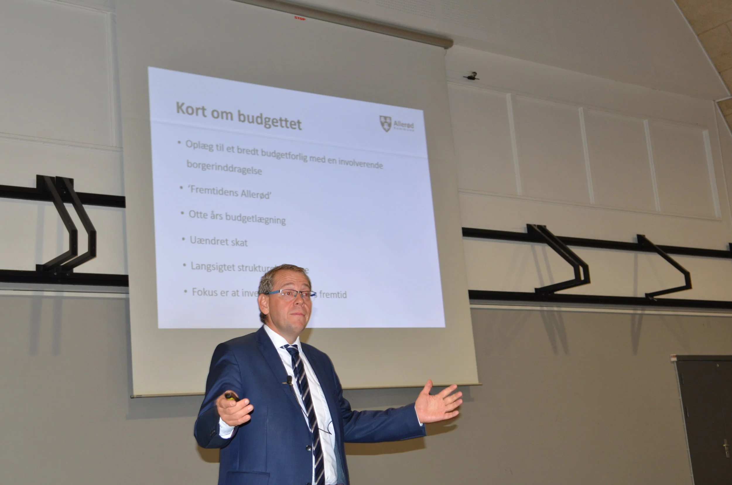 Kommunaldirektør Morten Knudsen fremlagde først nogle af de større og generelle betragtninger – blandt andet, at der nu kigges 8 år frem tiden. Generelt er Allerød Kommunes økonomi robust, kassebeholdningen ligger stabilt omkring de ca. 70 mio kroner, og kommunens samlede økonomi er på 1,4 mia. kr., oplyste kommunaldirektøren.