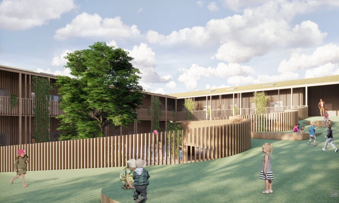 I sensommeren 2020 åbnes den ny daginstitution nr. 2 i Blovstrød (Bøgelunden) - med et budget på 43 mio. kr. Illustration: Vilhelm Lauritzen Arkitekter