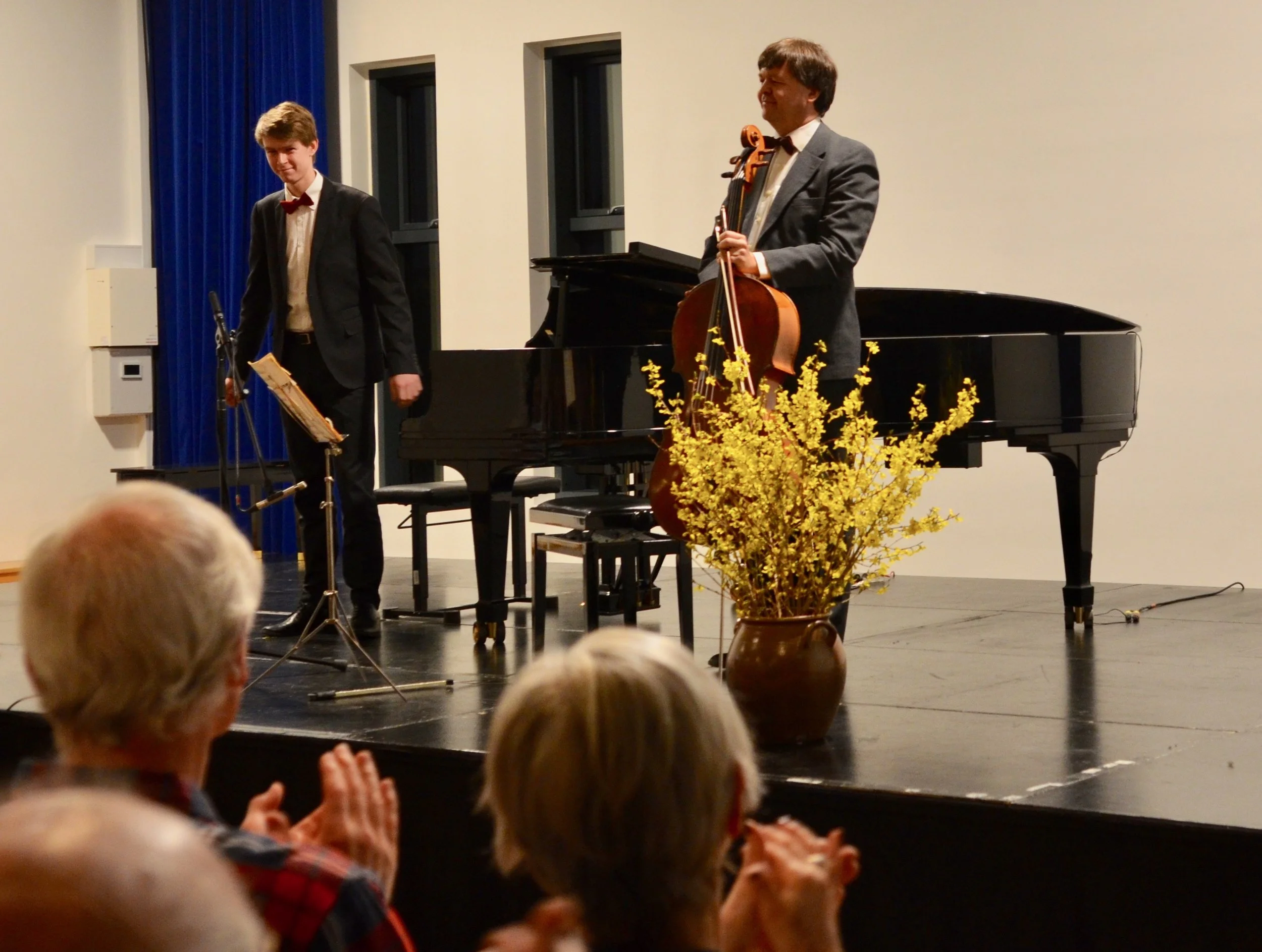 KONCERT Fredag aften havde Blovstrød-borgeren, Tonna Nielsen, inviteret sit kor, Lillerødkoret, med pårørende til koncert med korets dirigent, cellisten Klaus Munk-Nielsen, hans hustru, violinisten Anna og deres 21-årige søn, pianisten David. Uheldet ville, at Anna brækkede en arm ved et cykeluheld for kort tid siden, så trioen måtte erstattes af en duo med Klaus og David. På trods af den meget korte tid til indstudering af et nyt program gennemførte far og søn koncerten på fornemste vis.