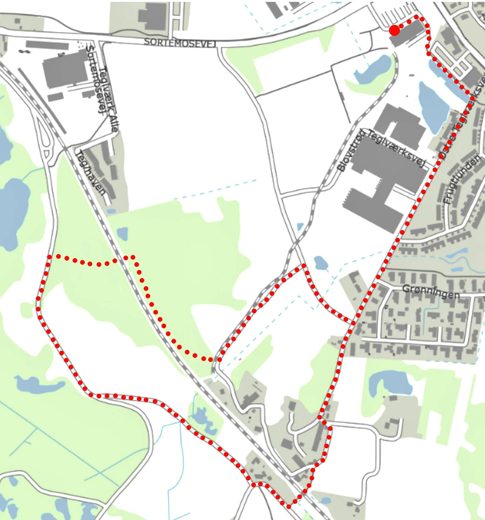 Der er to veje at vælge på vestsiden af S-banen. Vi vælger at dreje til højre i gennem mosen og under S-banen frem til Blovstrød Teglværksvej (som vist på kortet) og herfra tilbage til hallen via Østre Teglværksvej. Sti-markering: Flemming Nyberg/AOB
