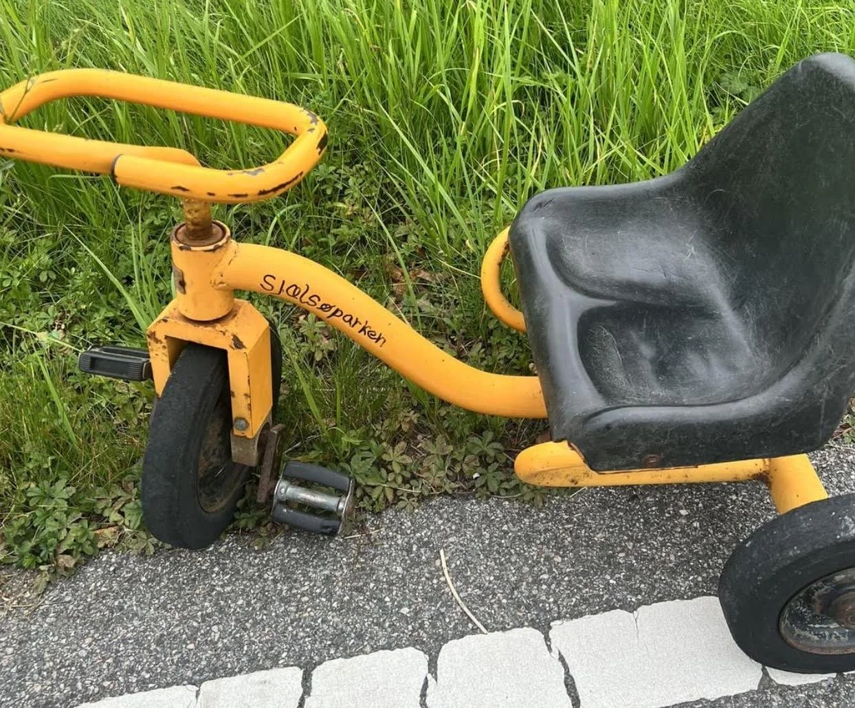 Der står en lille herre-løs gocart på Sandholmgårdsvej. Cyklen er påført teksten: ’ Sjælsøparken’. Foto: Heidi Thygesen